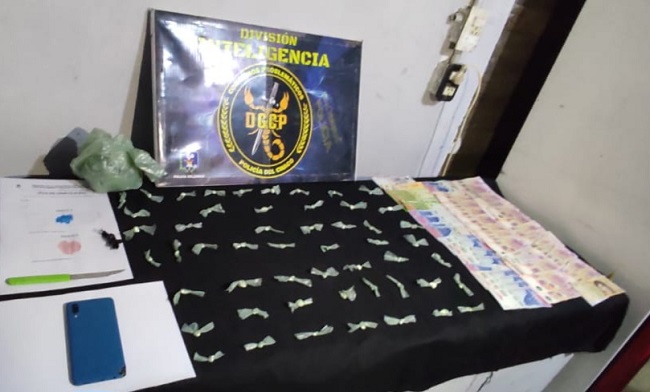 El operativo comenzó a horas 19.30 donde el morador, un hombre de 38 años quedó detenido luego de hallar en distintos lugares de la casa la cantidad de 52 envoltorios de diferentes tamaños, conteniendo Cocaína con un peso de 24 gramos, una bochita con 9 gramos de marihuana, un cuchillo con sustancia, un celular y $14.960.