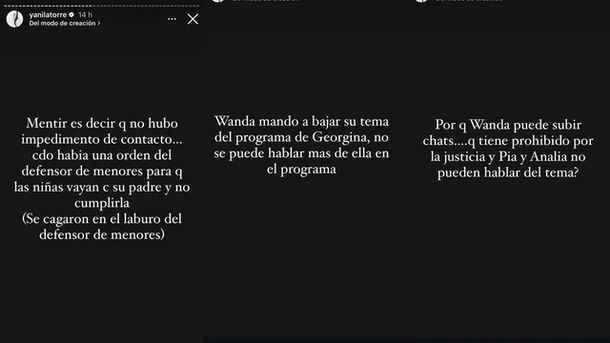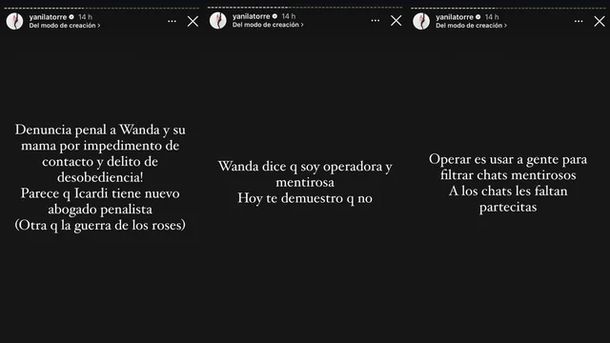 “Denuncia penal a Wanda y su mamá por impedimento de contacto y delito de desobediencia! Parece que Icardi tiene nuevo abogado penalista (otra que la guerra de los roses)”, escribió Yanina Latorre en Instagram antes de aclarar: “Wanda dice que soy operadora y mentirosa. Hoy te demuestro que no”.